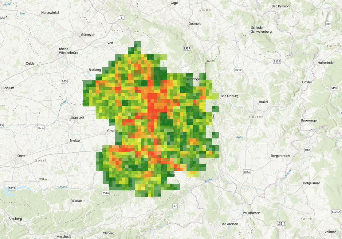 Gemeinsam mit dem Fraunhofer Institut für Umwelt-, Sicherheits- und Energietechnik (UMSICHT) haben wir im Jahr 2024 ein Modell zur Kartierung von Reifenabrieb, dem TyreWearMapping, für die Region Paderborn entwickelt. Eine interaktive Karte, die Hotspots von Reifenabrieb und Mikroplastikeinträgen sichtbar macht!